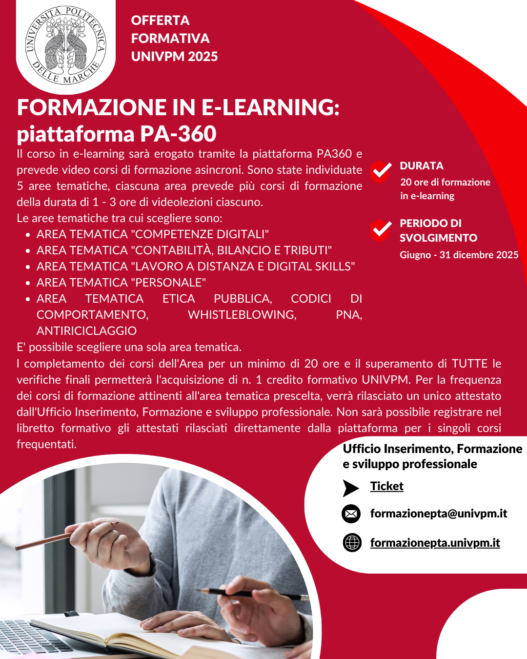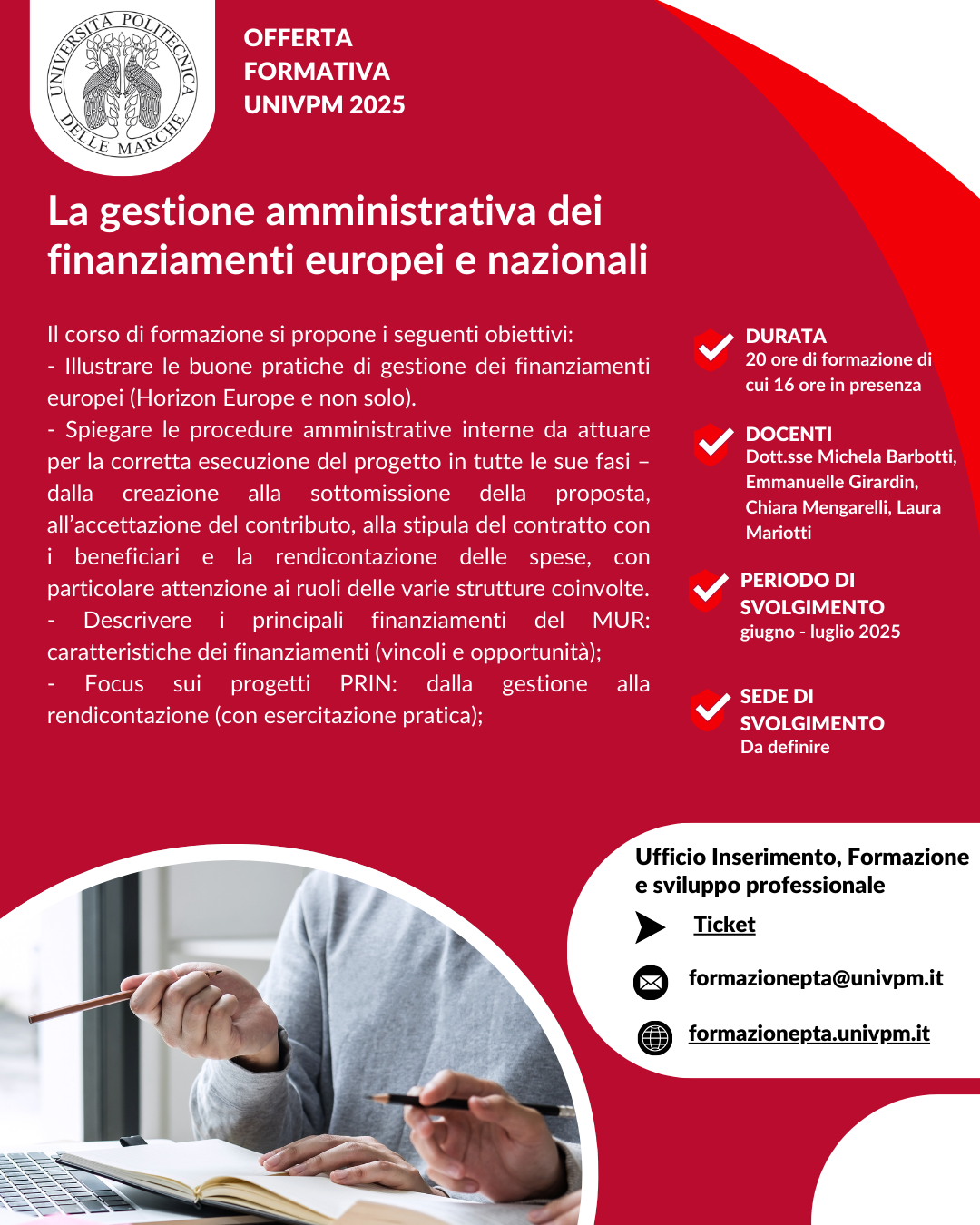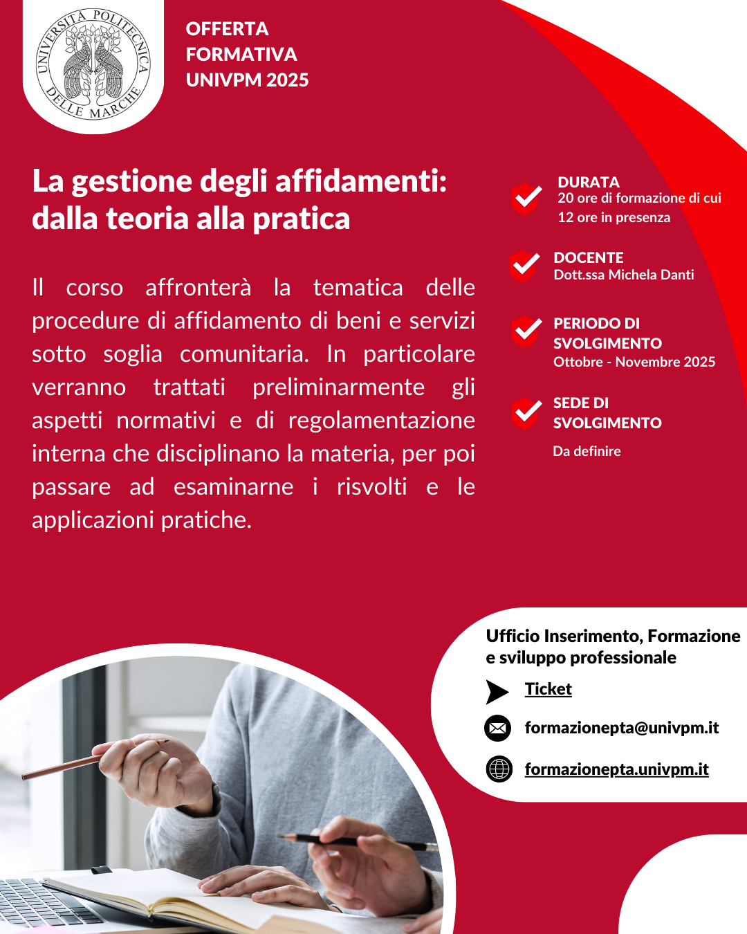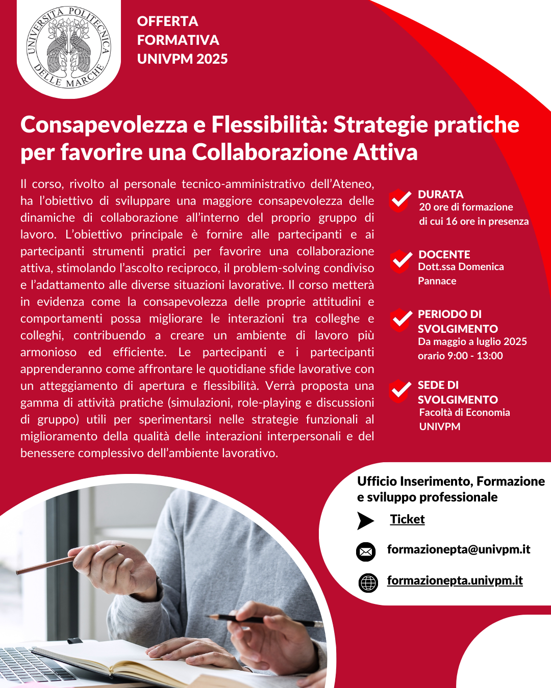 La partecipazione al progetto sostituirà il corso di formazione a catalogo per il personale selezionato.Info: Esplora UNIVPM