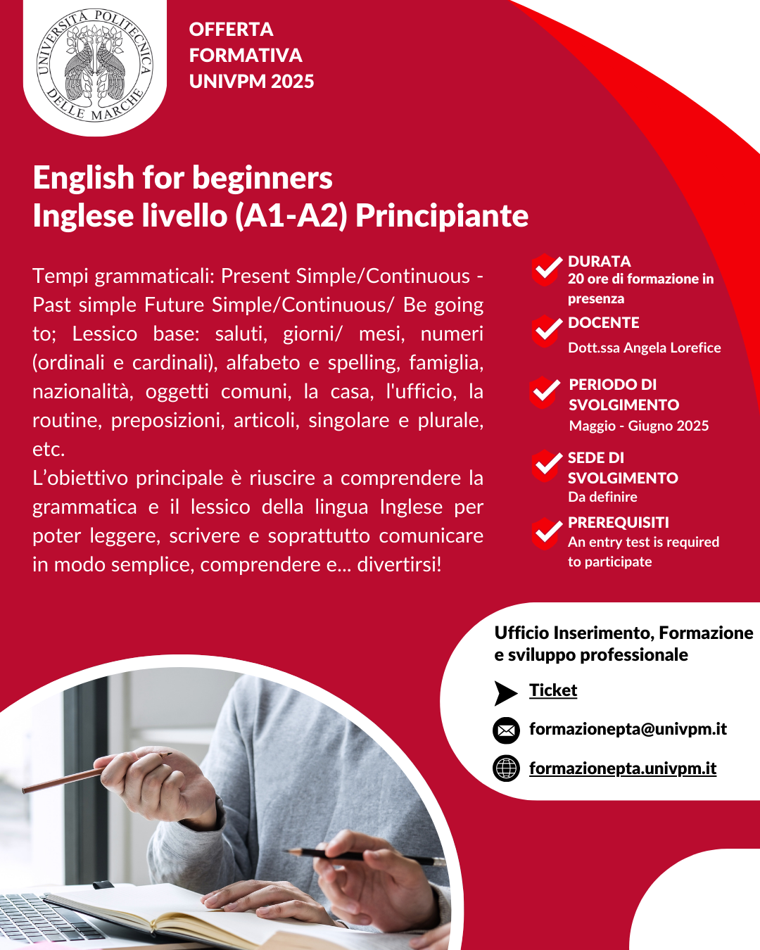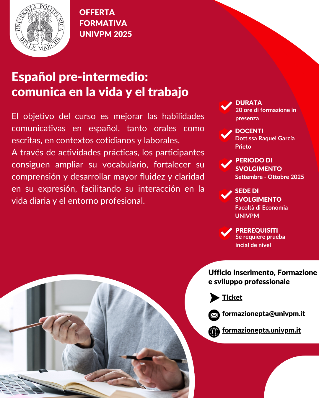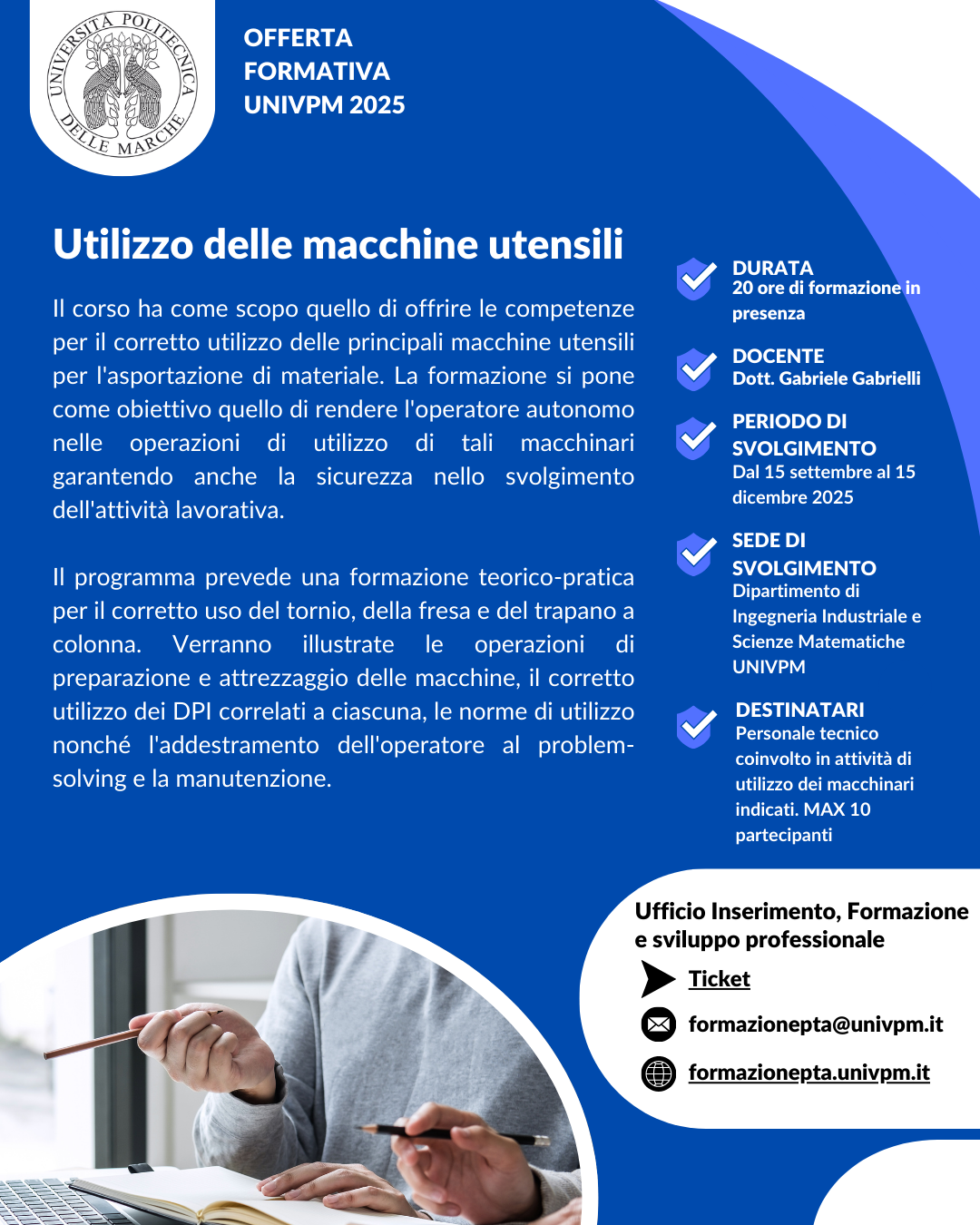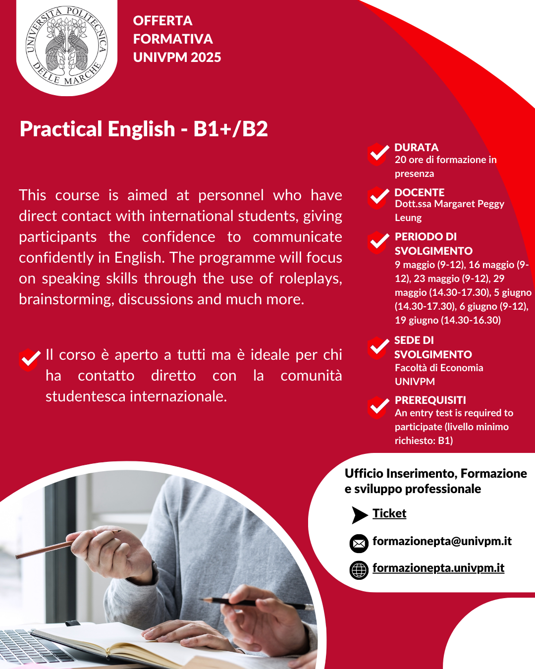 La partecipazione al progetto sostituirà il corso di formazione a catalogo per il personale selezionato.Info: Esplora UNIVPM