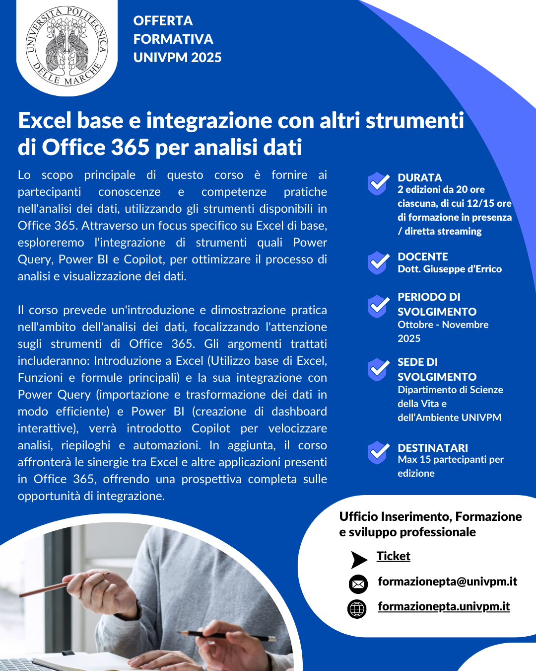 - Excel base e integrazione con altri strumenti di Office 365 per analisi dati - n. 2 edizioni, massimo 15 partecipanti per ciascuna edizione