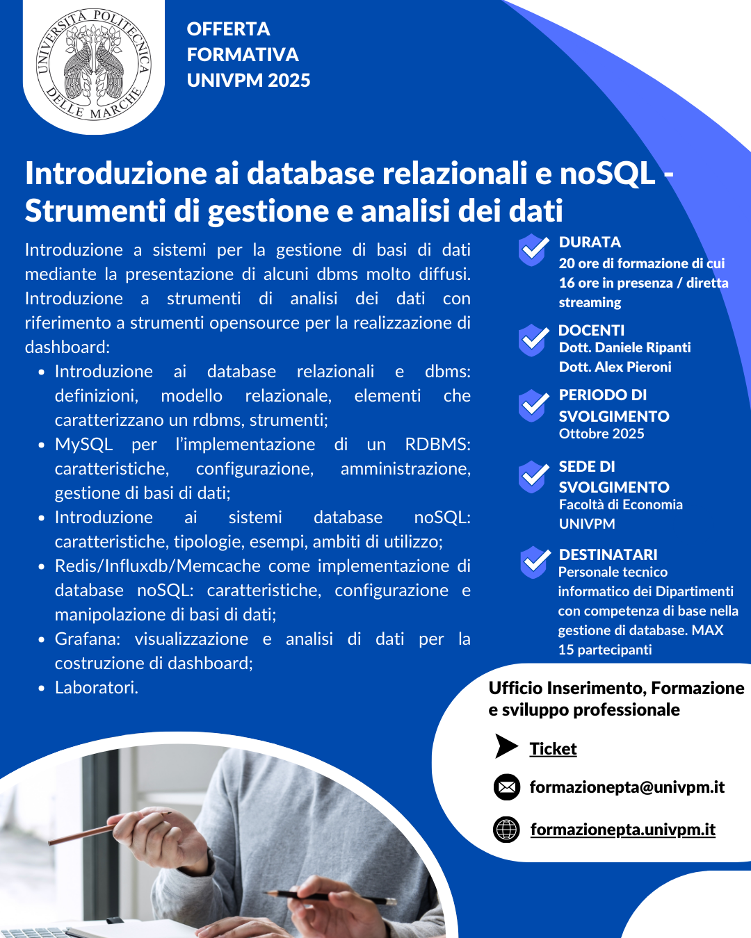 - Introduzione ai database relazionali e noSQL - strumenti di gestione e analisi dei dati - massimo 15 partecipanti - posti disponibili