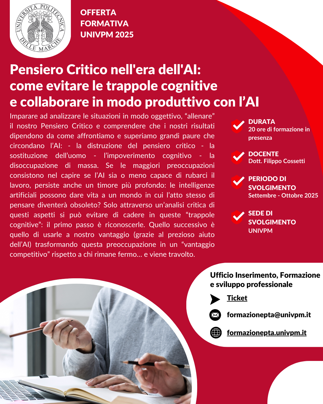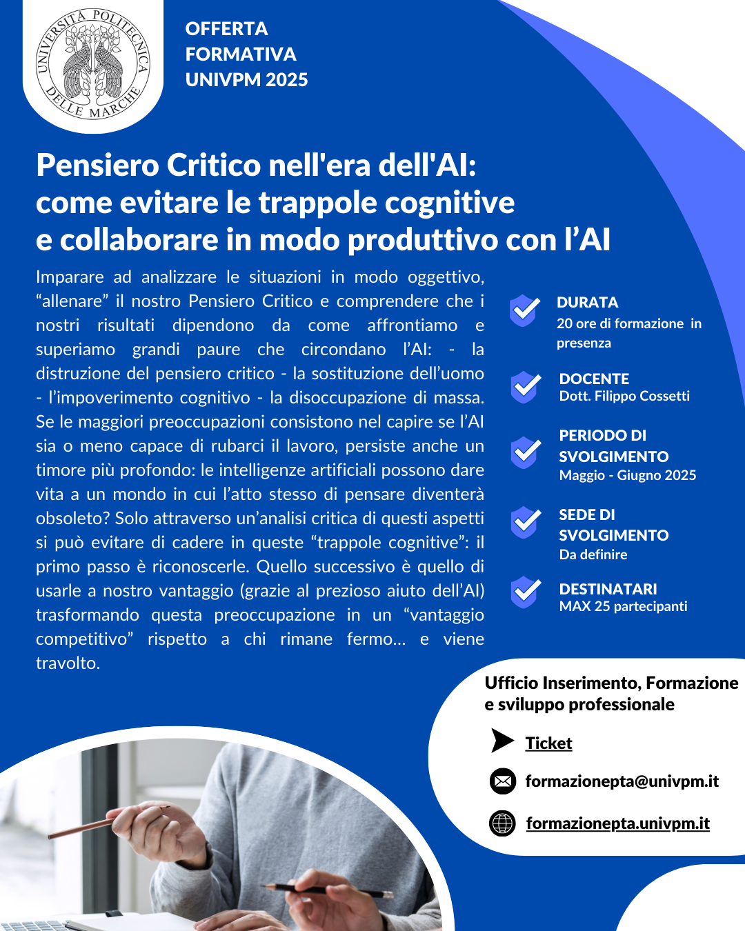 - Pensiero Critico nell'era dell'AI: come evitare le trappole cognitive e collaborare in modo produttivo con l’AI - massimo 25 partecipanti - POSTI ESAURITI