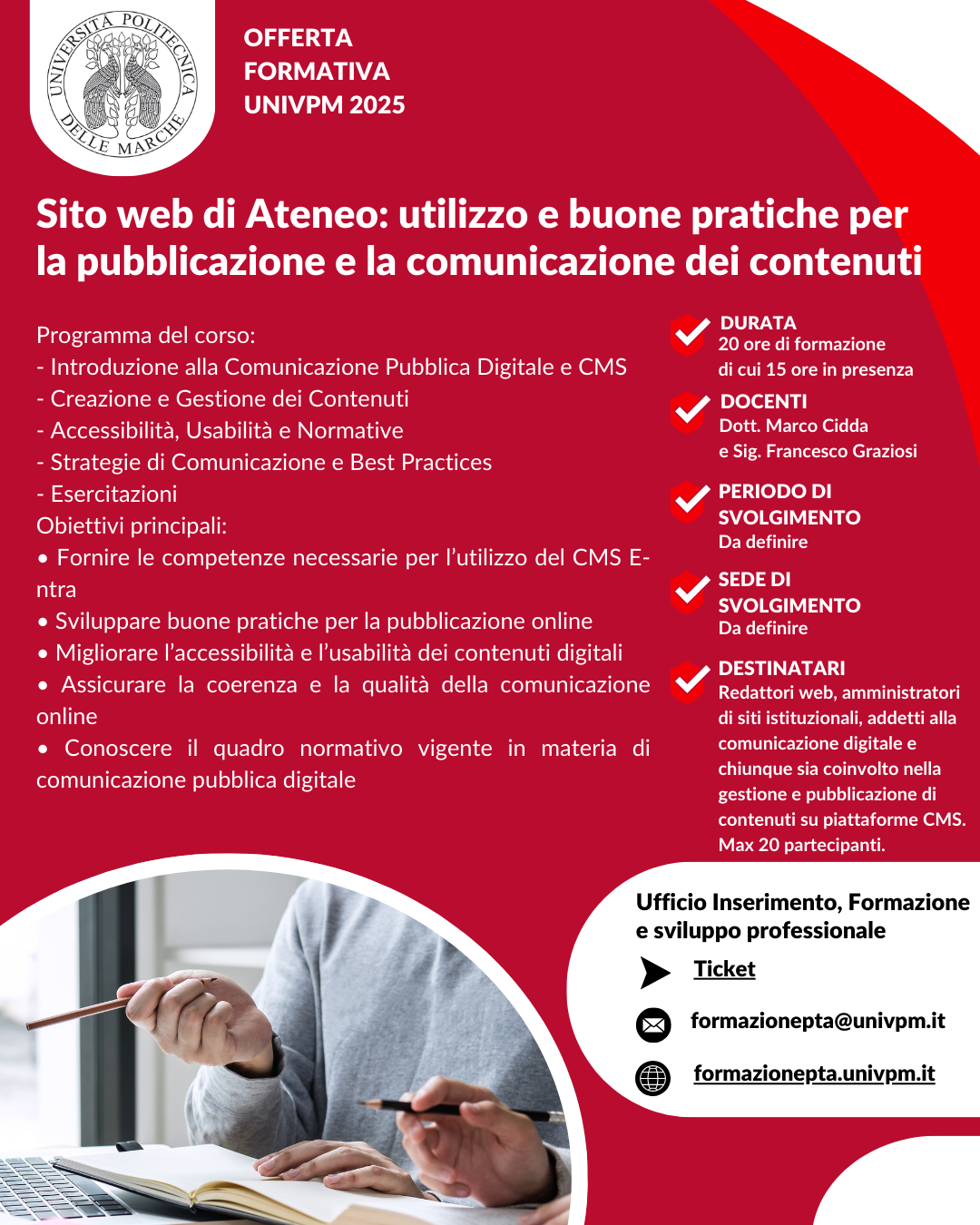 - SITO WEB DI ATENEO: Utilizzo e Buone Pratiche per la Pubblicazione e la Comunicazione dei contenuti- massimo 20 partecipanti - POSTI ESAURITI