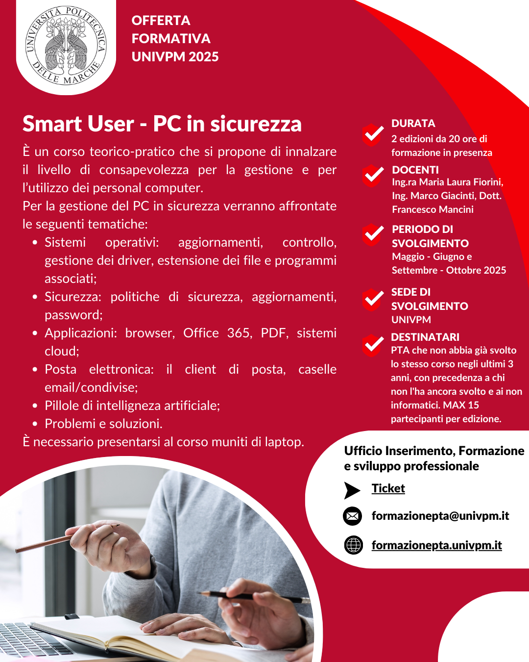 - Smart User - PC in sicurezza - n. 2 edizioni, massimo 15 partecipanti per ciascuna edizione - POSTI ESAURITI