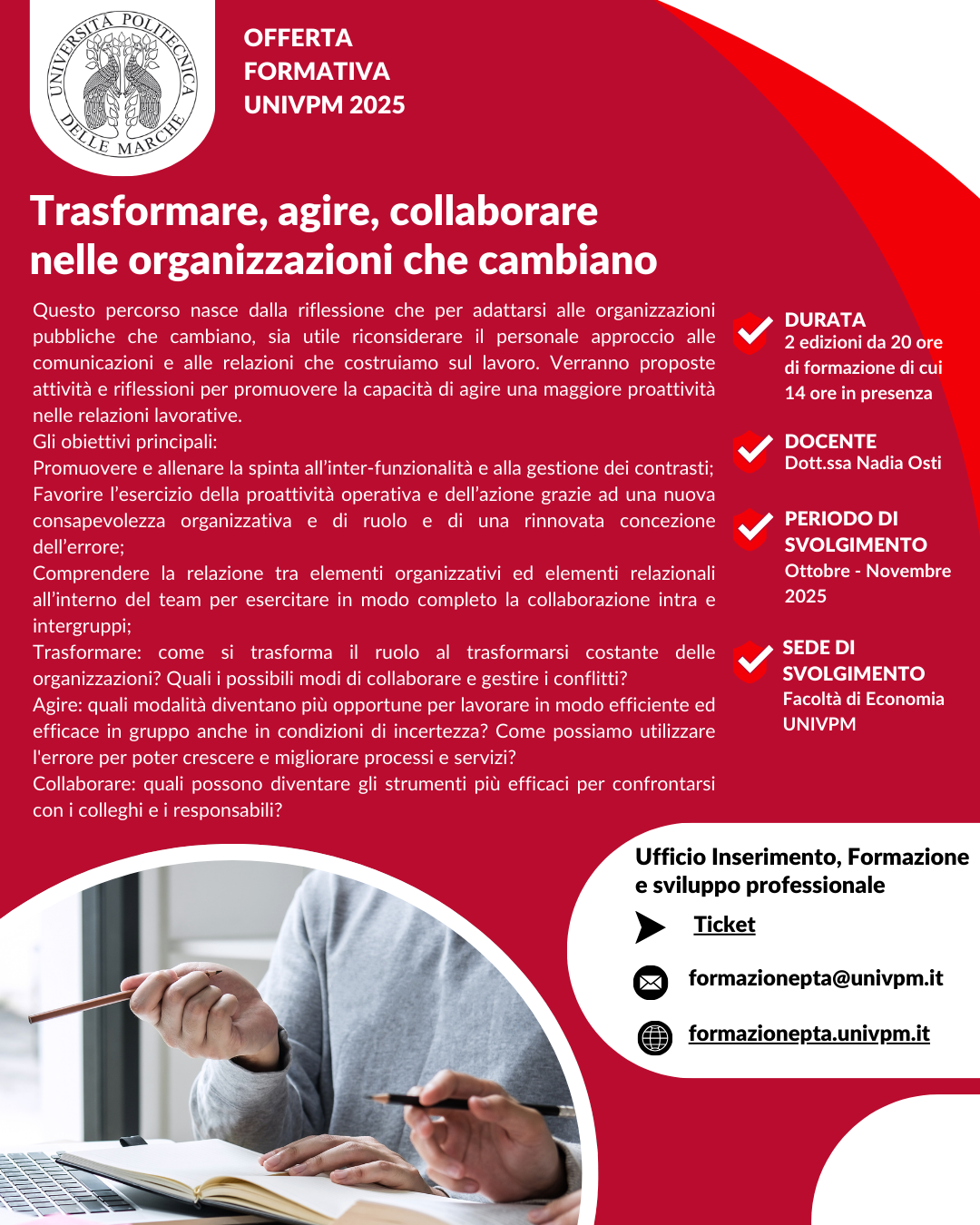 - Trasformare, agire e collaborare nelle organizzazioni che cambiano - n. 2 edizioni, massimo 20 partecipanti per ciascuna edizione (solo per il personale che non lo abbia già svolto nel 2024) - POSTI ESAURITI