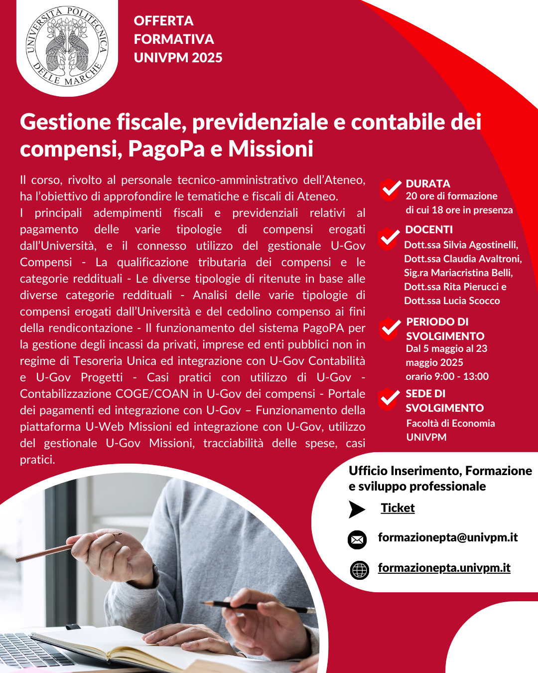 - Gestione fiscale, previdenziale e contabile dei compensi, PagoPA e missioni - massimo 20 partecipanti - CONCLUSO